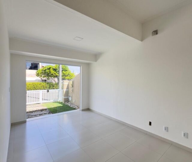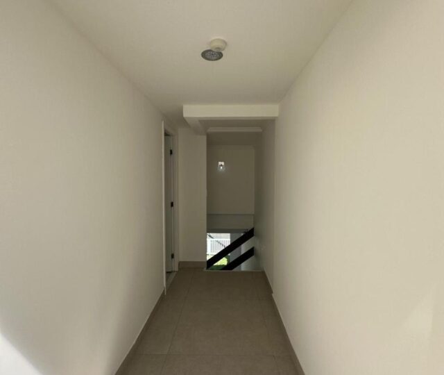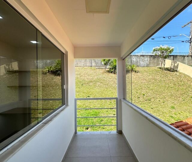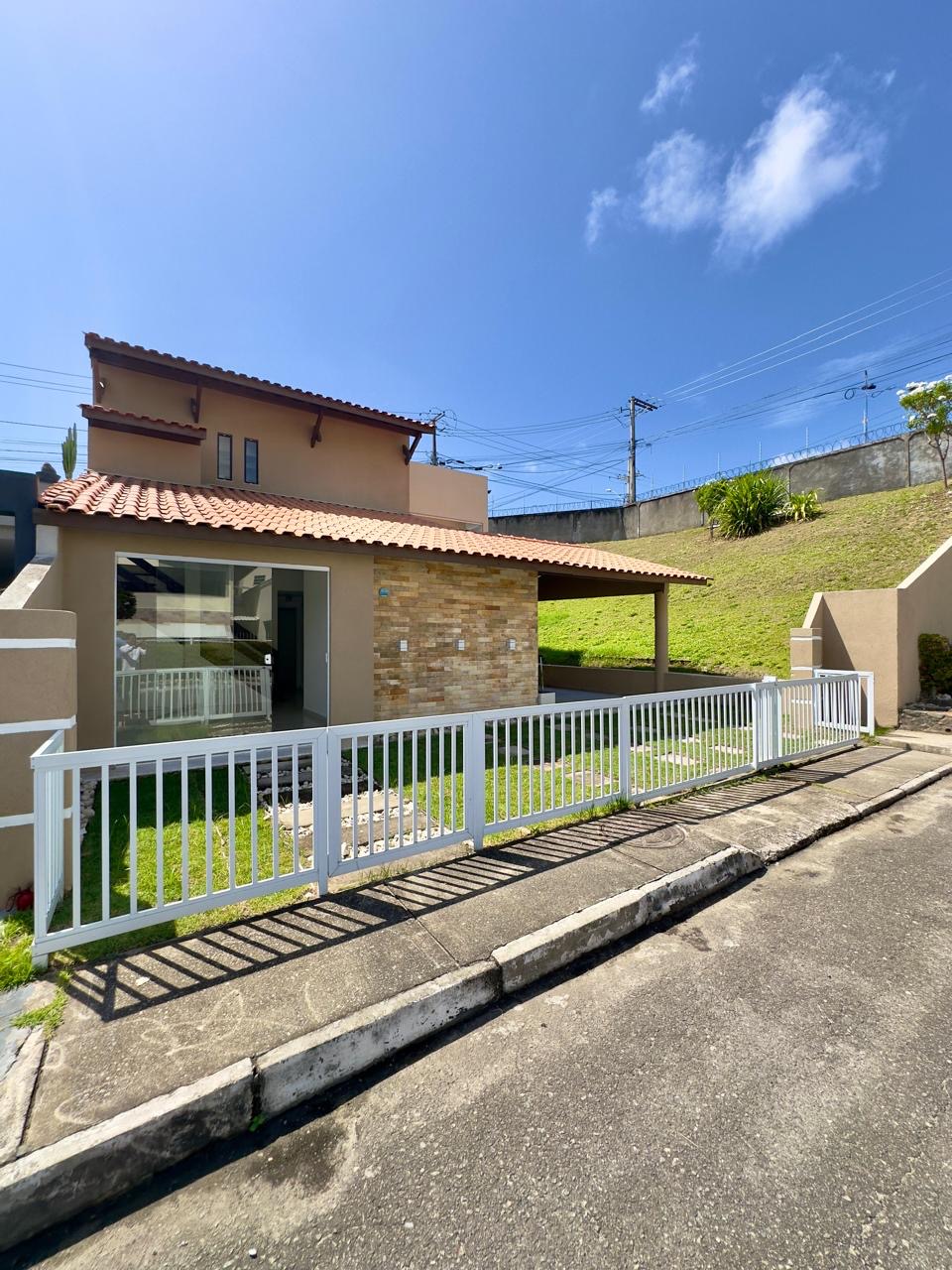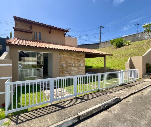 A casa dispõe de varanda superior, claraboia com ventilação, área de serviços funcional e garagem coberta para dois veículos.